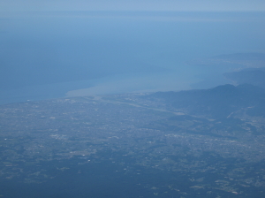 8月の「海から富士山」のスタート地点、富士川と河口付近が良く見え、台風の後なので、河口一帯の