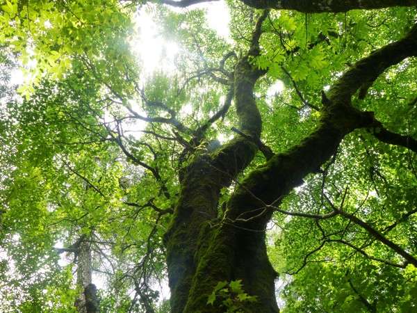 登山道を外れた自然林の中でひっそりと立つカエデの巨木。