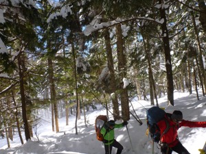 蓼科山山頂を目指し、地図読みを重ねながら3時間半ほどラッセルで尾根筋を目指すも、標高差にして頂上から150m(?)ほどの沢筋の雪量に圧倒されて敗退・・・と、絵に描いたような雪山登山が楽しめました。