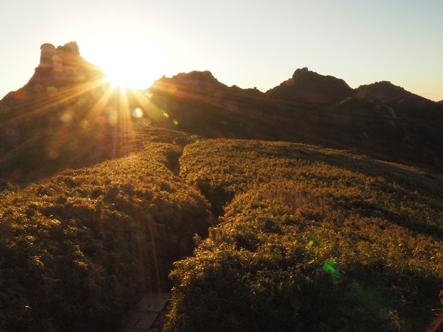 暗い森を歩き続け、森林限界を抜けて、奥岳の稜線に出る頃には、東の空が明るくなってきました。
