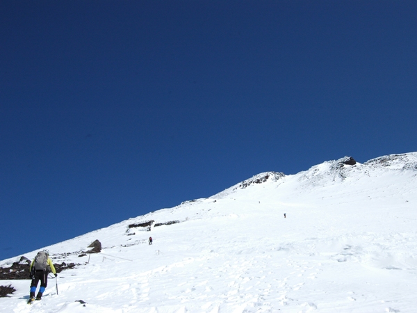 5-6合目付近で歩行技術とピッケルアイゼンを使った雪上技術を学びます。