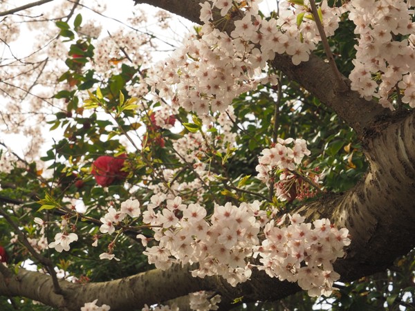 (衣笠の市街地で見かけた、ソメイヨシノと椿の共演)