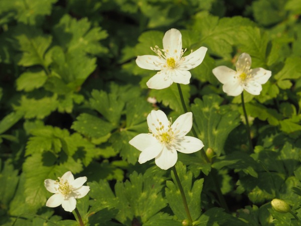 照葉樹を中心とした緑が濃い三浦半島の森が、白に近い桜色や広葉樹の新緑など、色とりどりに染まっています。