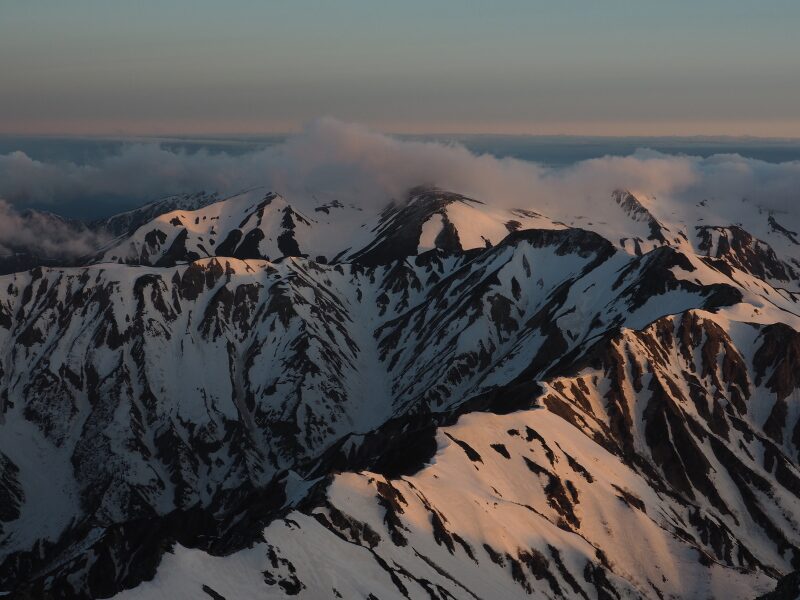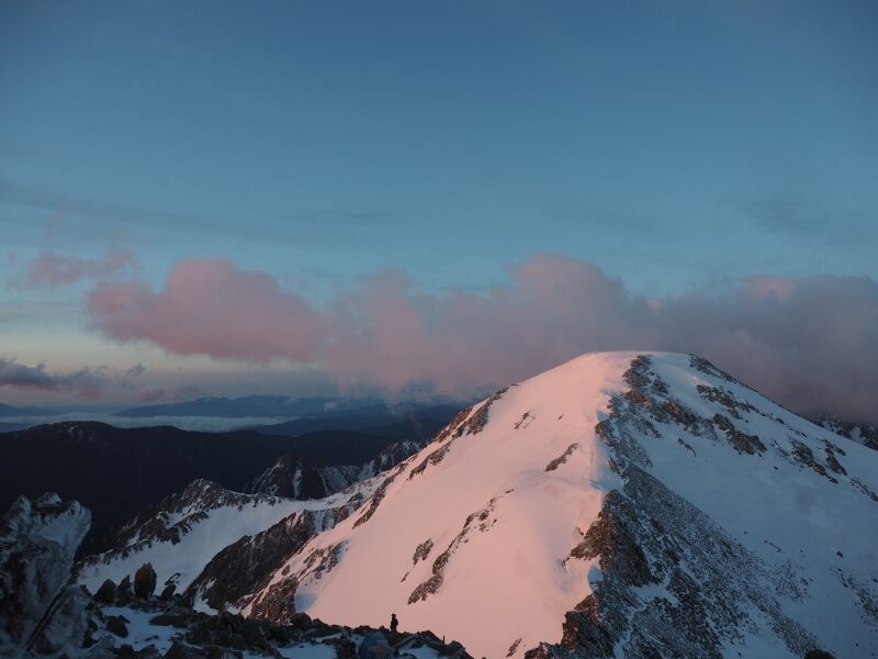 朝陽に染まる前穂高岳は新雪をまとっていました。