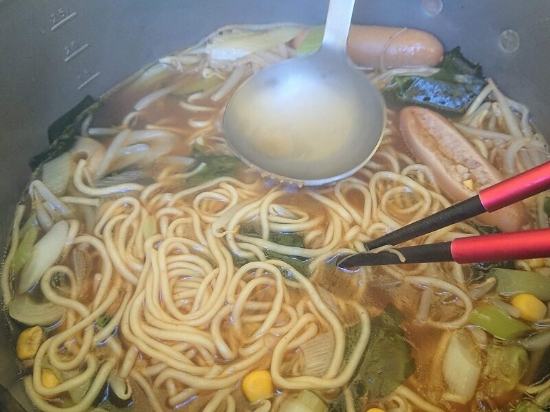 具材のウィンナーや長ネギは入山して早く使わないといけないので、初日の夕食にしました。