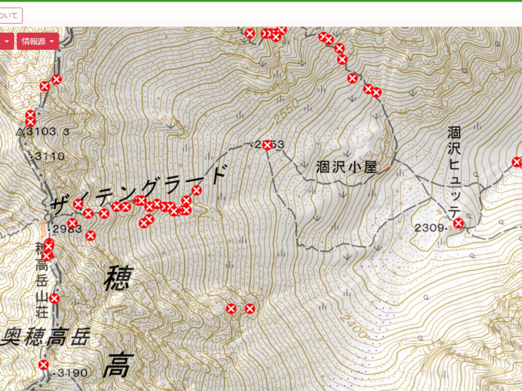 2017年以降の遭難発生地点が赤印で示されています