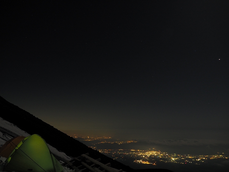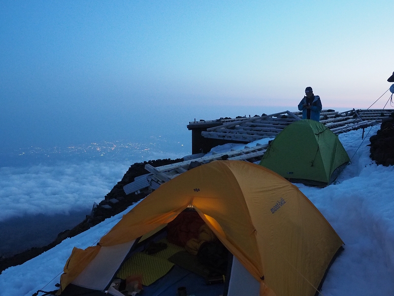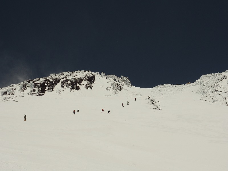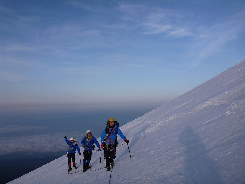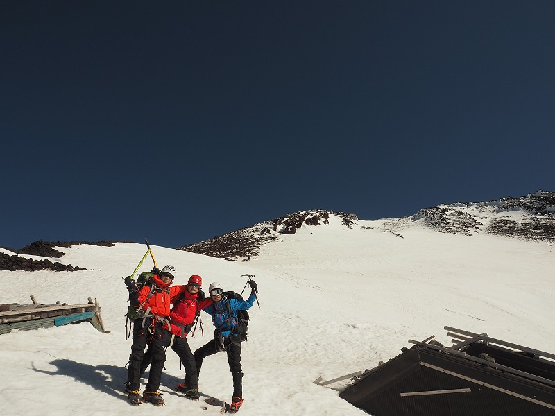 雪山初心者でも参加OKですが、テント泊装備を背負って7合目まで登り、一日で山頂を往復できる体力が必要です。