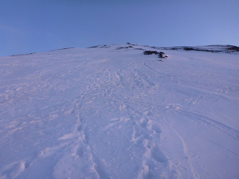 青空の中にまっすぐ山頂に伸びる雪面。