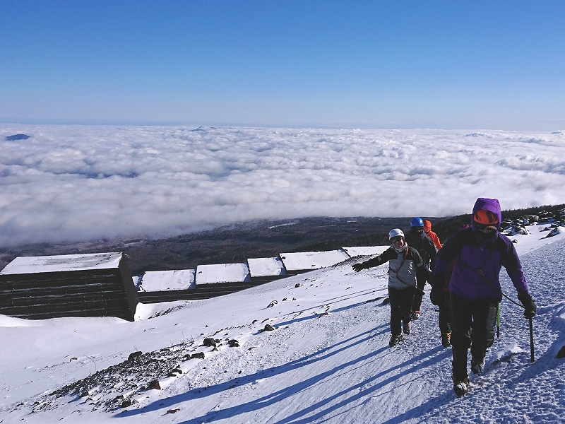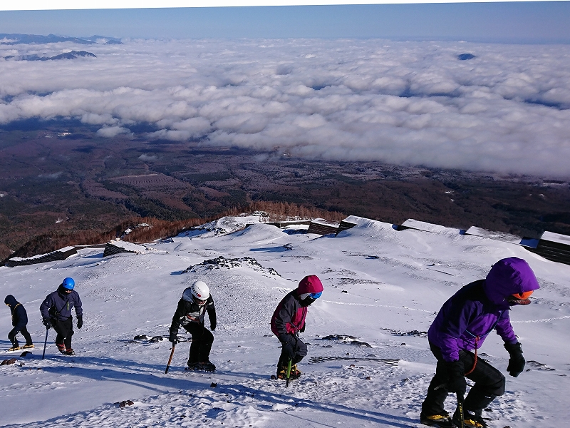 この講習会では、富士山唯一の通年営業・富士吉田口5合目の佐藤小屋に宿泊し、5-6合目付近の講習に適した安全な斜面で、基礎技術の講習を行っています。