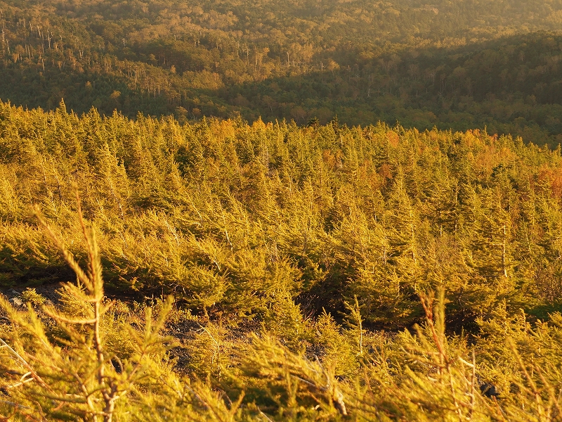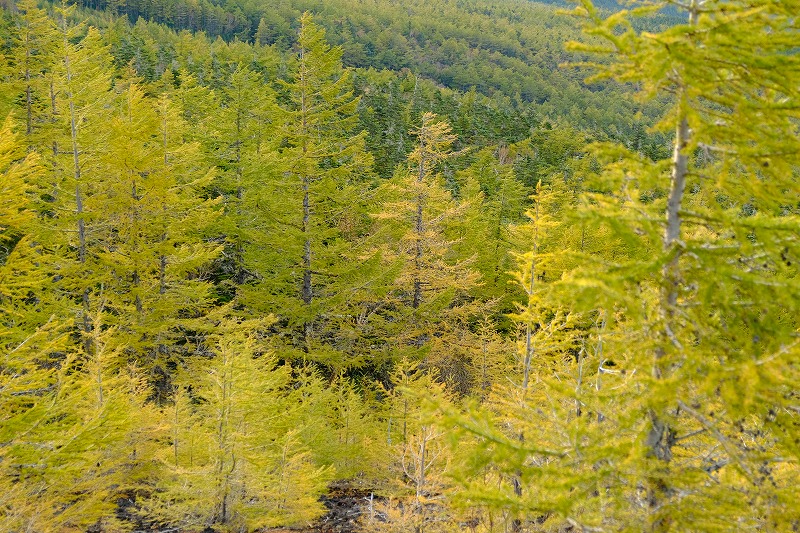 10月は森林限界付近に生育するカラマツの樹が一斉に黄色に色づく季節です。