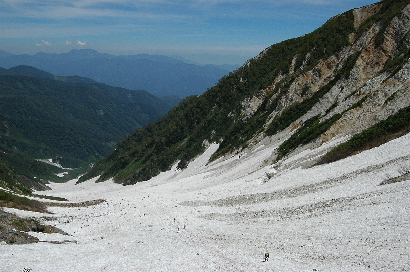 白馬大雪渓を登りますが、雪渓歩きの経験がなくても、ガイドと一緒であれば安心です