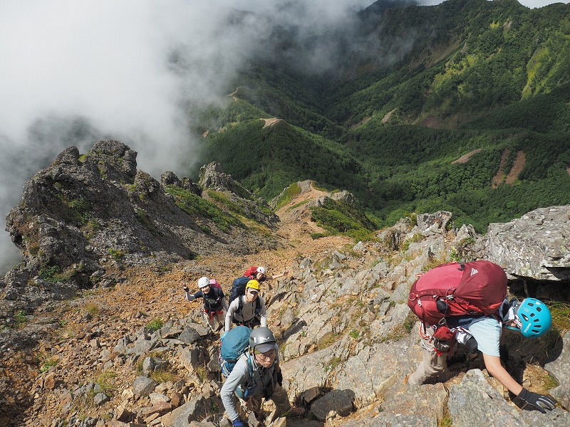 岩場の歩行技術だけでなく、休憩や、体温調整など稜線での縦走に必要な知識をレクチャーしながら歩きます。