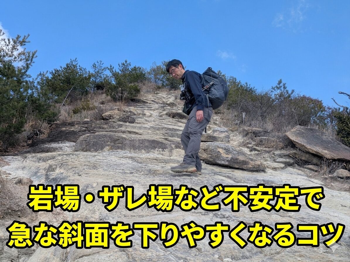 タイトル通り、岩場やザレ場など不安定で急な斜面を下る時に役立つ、「横歩き」を解説してます