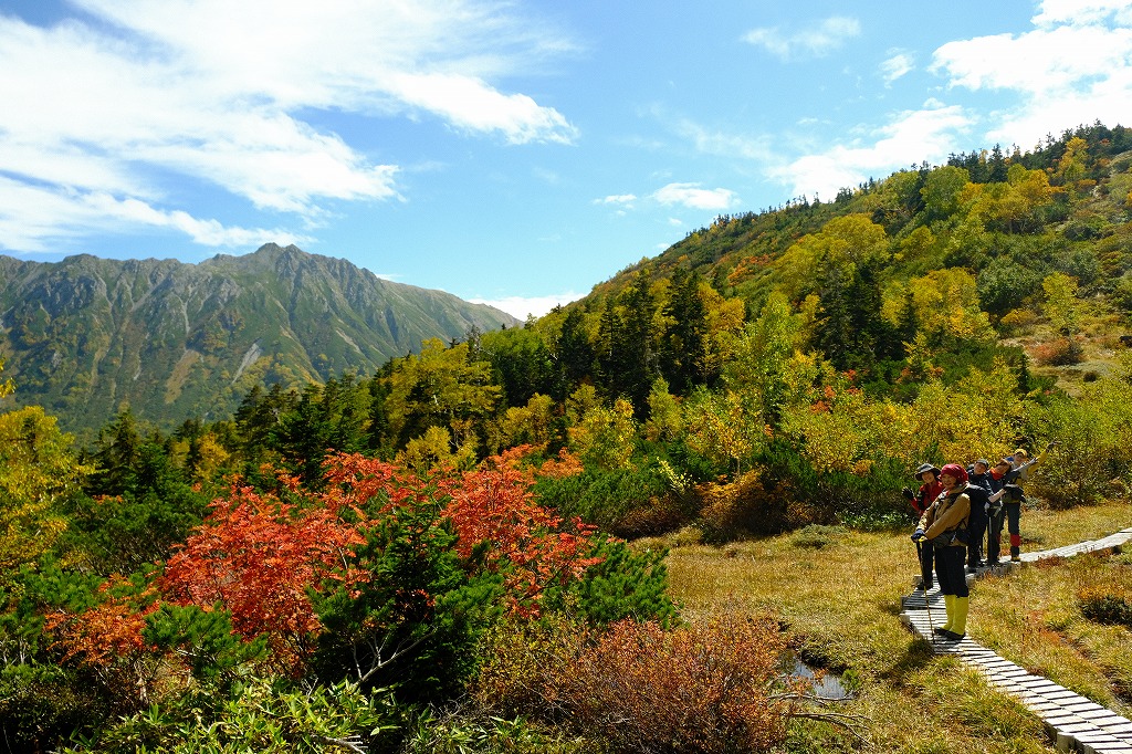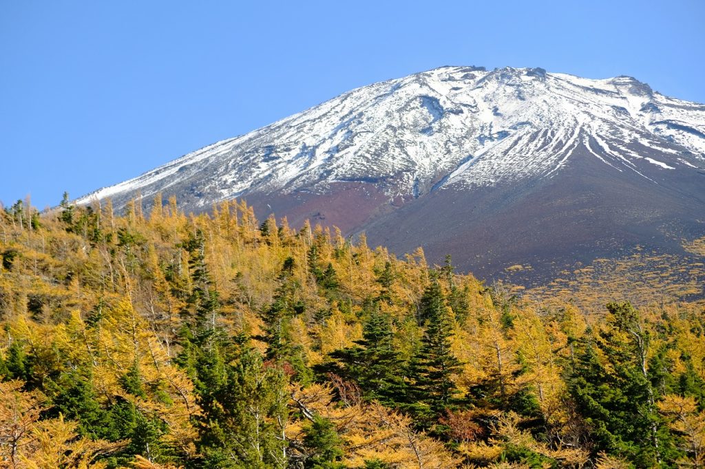 カラマツの黄色と真っ青な空、冠雪の山頂とのコントラストは最高